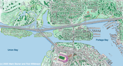 Correspondence: Letter to WSDOT - March 1, 2005 Response from WSDOT - March 17, 2005 WSDOT statement regarding the Signature Bridge Proposal (PDF) - February 17, 2005 - WSDOT commits to study structural and engineering feasibility and conduct traffic analysis Our Original Vision (Click to enlarge; note north is at the bottom.) The following slideshow was used to roll out our original vision, which has since evolved in collaboration with WSDOT. It remains here to help tell the story of how we forever changed the dynamic on the SR-520 project. Download PDF version of presentation (3 MB)